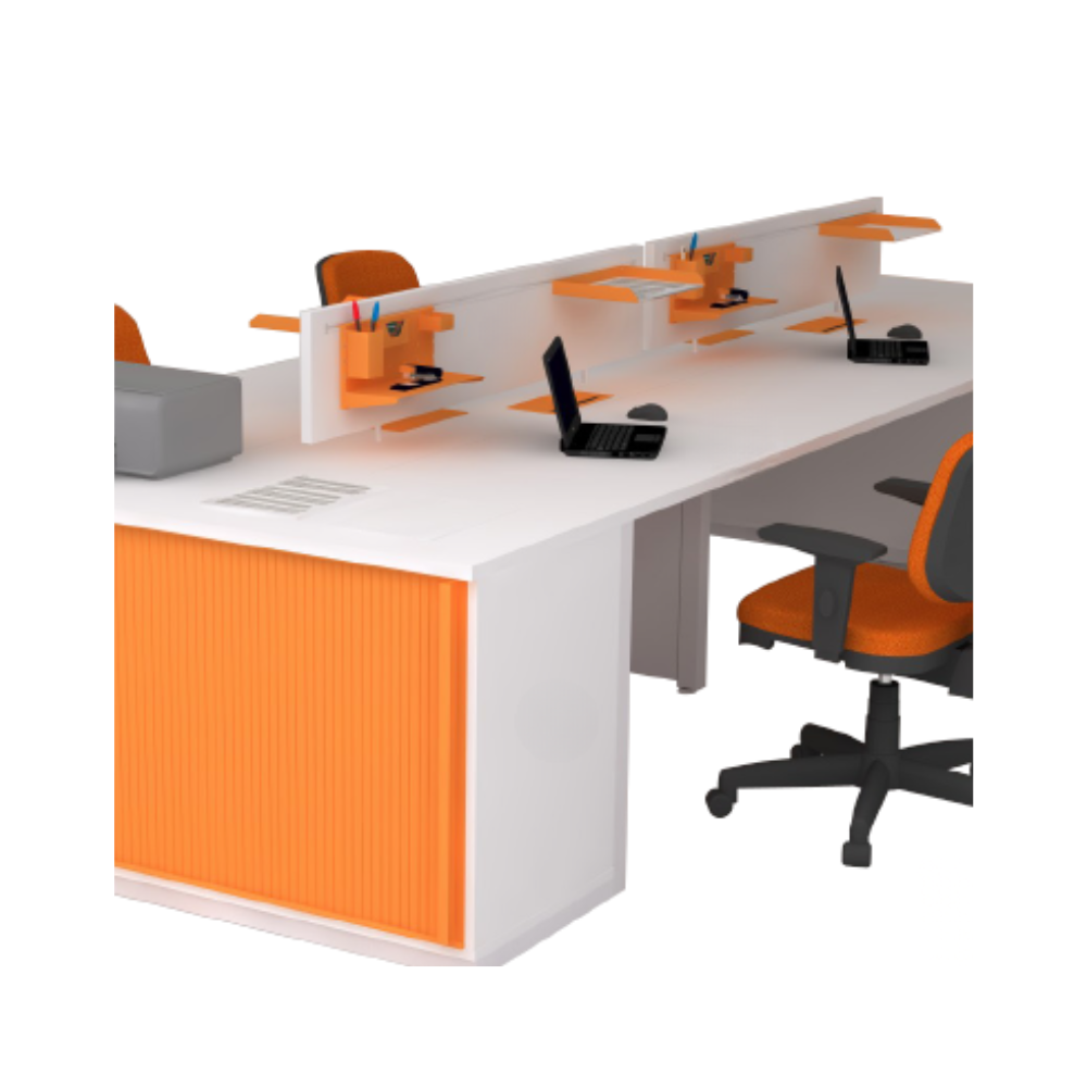 Acompanha biombos frontais com friso, permitindo o acoplamento de acessórios, tomadas e calhas elétricas e armario baixa para plataformas, com portas em pvc com diversas cores, tornando o ambiente ainda mais prático e funcional.